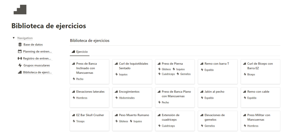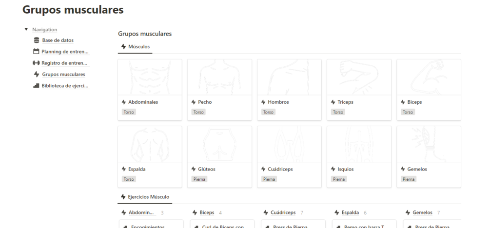 - Grupos musculares y ejercicios predefinidos: hemos añadido muchísimos ejercicios de gimnasio o para hacer en casa con el grupo muscular que se trabaja en cada uno. Sin embargo, si deseas añadir un ejercicio o un grupo muscular que no se encuentre en la plantilla, en la guía de uso te mostramos cómo hacerlo.